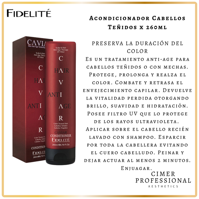 Es un tratamiento anti-age para cabellos teñidos o con mechas. Protege, prolonga y realza el color. Contiene extracto de caviar, D-Pantenol y proteínas de trigo, seda, soja y arroz. Combate y retrasa el envejecimiento capilar. Devuelve la vitalidad perdida otorgando brillo, suavidad e hidratación. Posee filtro UV que lo protege de los rayos ultravioleta.