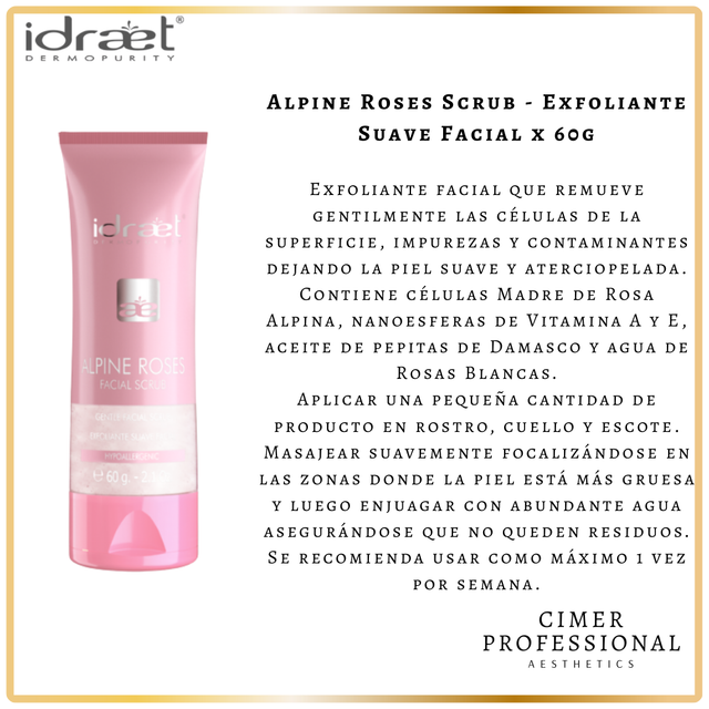 Exfoliante facial que remueve gentilmente las células de la superficie, impurezas y contaminantes dejando la piel suave y aterciopelada. Contiene células Madre de Rosa Alpina, nanoesferas de Vitamina A y E, aceite de pepitas de Damasco y agua de Rosas Blancas.