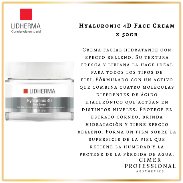Crema facial hidratante con efecto relleno. Su textura fresca y liviana la hace ideal para todos los tipos de piel.Fórmulado con un activo que combina cuatro moléculas diferentes de ácido hialurónico que actúan en distintos niveles. Protege el estrato córneo, brinda hidratación y tiene efecto relleno. Forma un film sobre la superficie de la piel que retiene la humedad y la protege de la pérdida de agua.