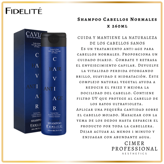 Es un tratamiento anti-age para cabellos normales. Proporciona un cuidado diario. Contiene extracto de caviar, D-Pantenol, un complejo natural vegetal y proteínas de trigo, seda, soja y arroz. Combate y retrasa el envejecimiento capilar. Devuelve la vitalidad perdida otorgando brillo, suavidad e hidratación. Este complejo natural vegetal ayuda a reducir el frizz y mejora la docilidad del cabello. Contiene filtro UV que protege al cabello de los rayos ultravioleta.