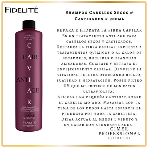 Es un tratamiento anti-age para cabellos secos y castigados. Restaura la fibra capilar expuesta a tratamientos químicos o al calor de secadores, bucleras o planchas alisadoras. Contiene extracto de caviar, D-Pantenol y proteínas de trigo, seda, soja y arroz. Combate y retrasa el envejecimiento capilar. Devuelve la vitalidad perdida otorgando brillo, suavidad e hidratación. Posee filtro UV que lo protege de los rayos ultravioleta.
