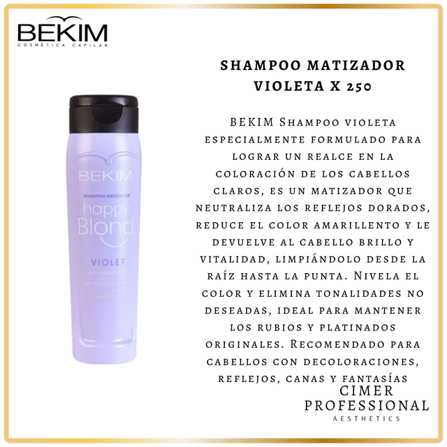 BEKIM Shampoo violeta especialmente formulado para lograr un realce en la coloración de los cabellos claros, es un matizador que neutraliza los reflejos dorados, reduce el color amarillento y le devuelve al cabello brillo y vitalidad, limpiándolo desde la raíz hasta la punta. Nivela el color y elimina tonalidades no deseadas, ideal para mantener los rubios y platinados originales. Recomendado para cabellos con decoloraciones, reflejos, canas y fantasías.